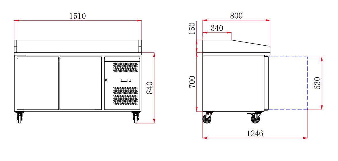 The EcoFrost 2 door pizza counter has a granite worktop and comes fitted with castors