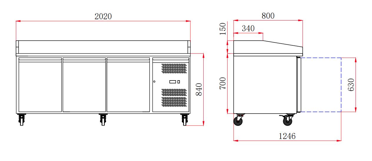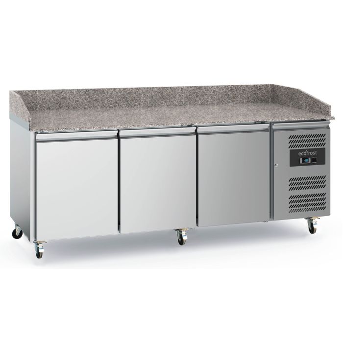 EcoFrost 3 door granite top pizza counter. Manufactured in stainless steel inside and out. Fitted with 3 x 400 x 600 shelves , Temperature range (°C) +2 / +8. The cabinet will hold 400 x 600 dough trays.